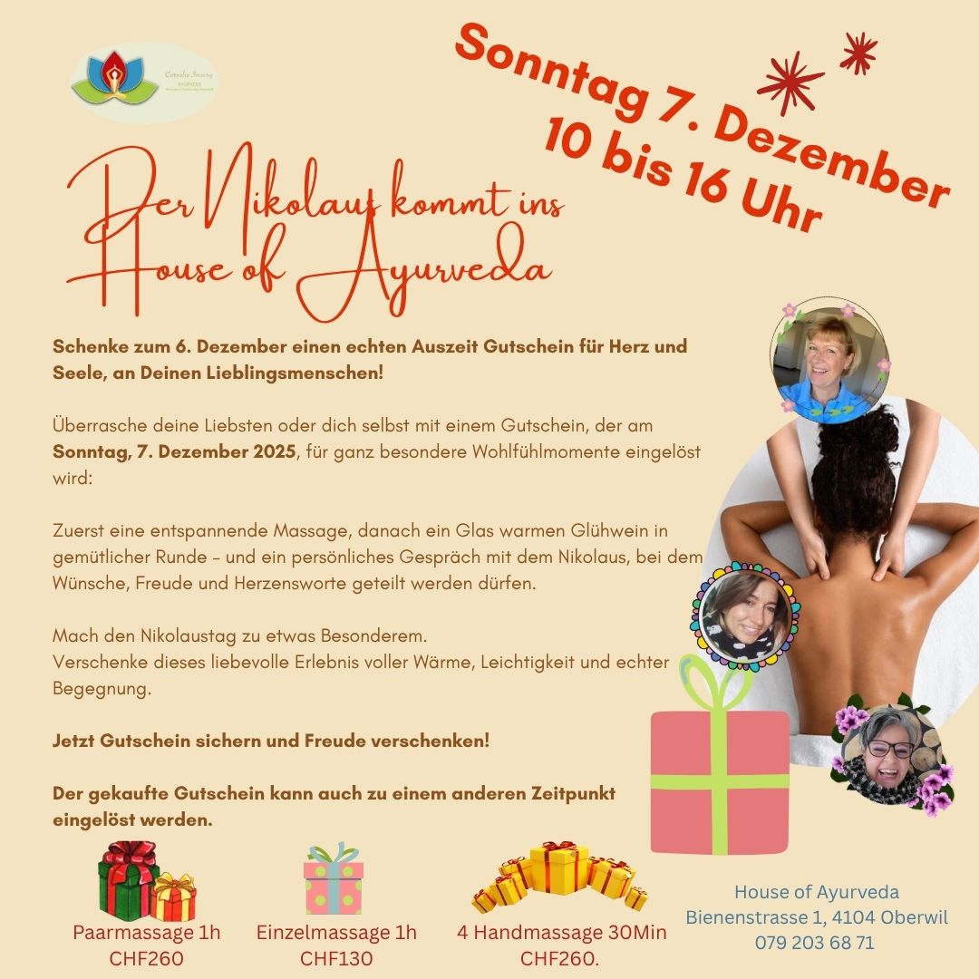 im House of Ayurveda, 4104 Oberwil, Bienenstrasse 1 – 10 bis 16 Uhr